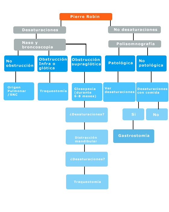 Afortunadamente, la gran mayoría de los niños mejoran en la respiración y alimentación, durante el primer mes de vida. Sólo unos pocos precisarán glosopexia y en su defecto distracción mandibular.